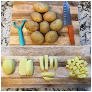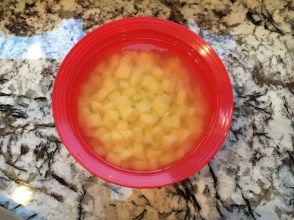 Potatoes contain an enzyme, that when exposed to oxygen, reacts to the produce and discolors the surface (turns gray-ish). The quality isn’t compromised and they’re still OK to eat, but the appearance is off-putting. I put the potato cubes in a cold water bath to deactivate the enzymes, so they keep their nice yellow color, until I need them for the soup.